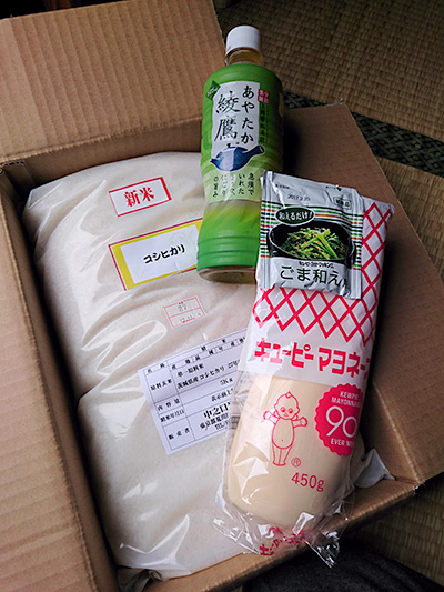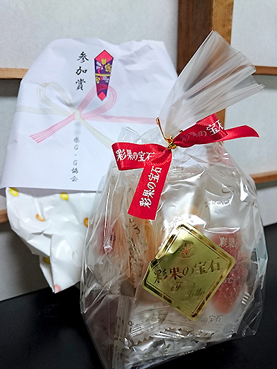 参加賞で「醤油」、ラッキー賞で「おかき(2袋)」頂きました。