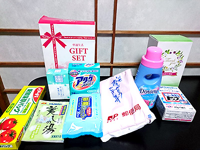 参加賞でギフトセット(石鹸、洗濯用洗剤、除菌ウェット、入浴剤、保存パック)とJPのタオル。