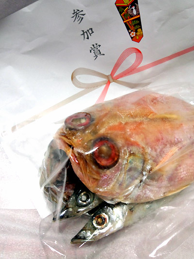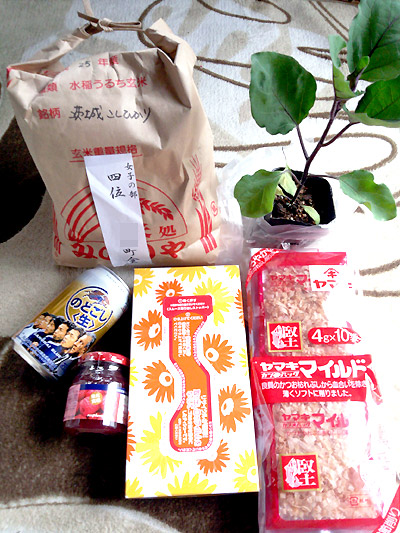 参加賞で箱ティッシュ、カツオ節、ビール、茄子の苗も貰いました☆